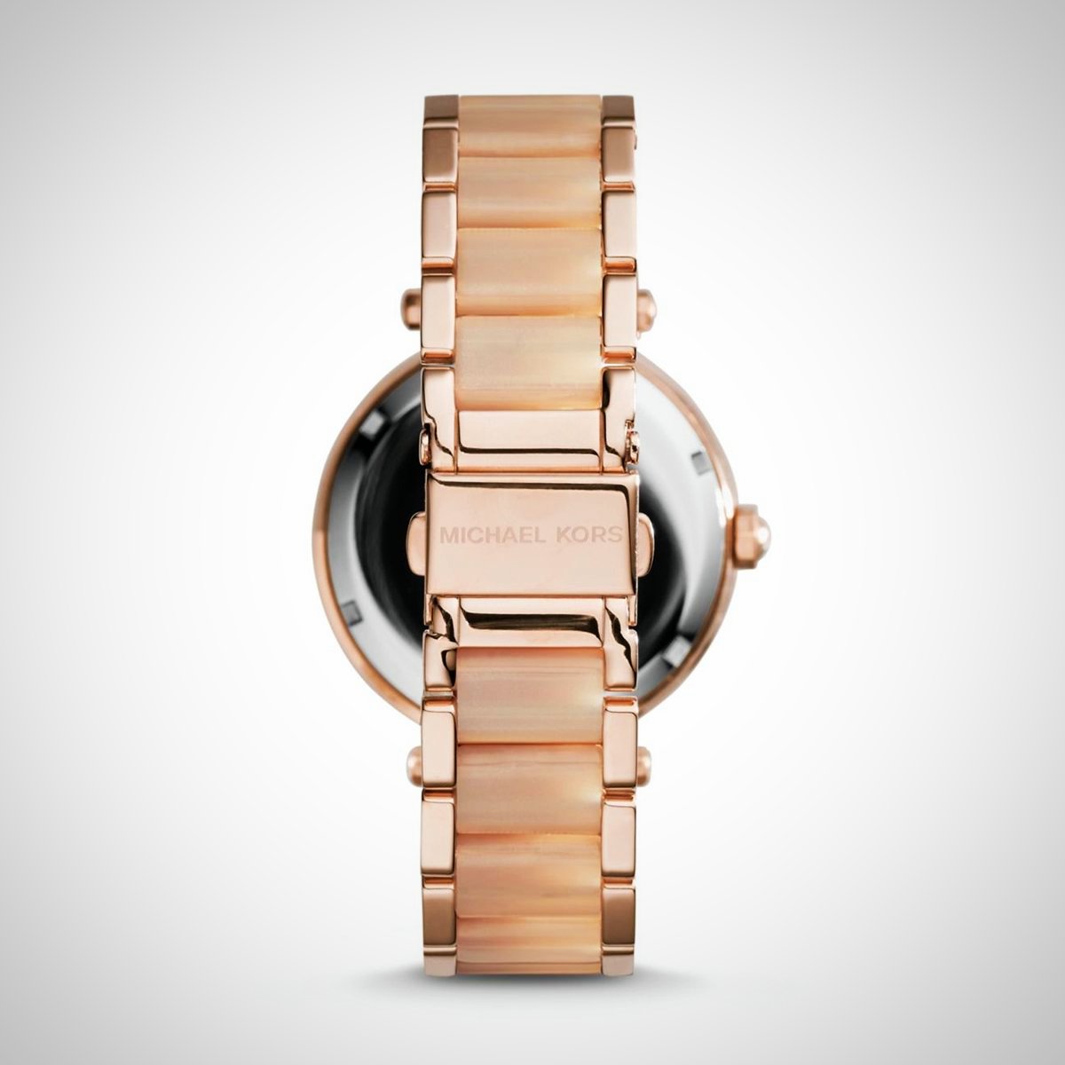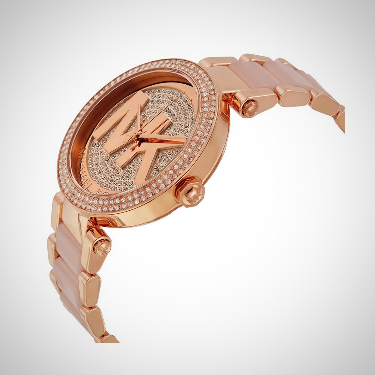 The MK6176 Parker Ladies’ Rose Watch features rose gold tone stainless steel case, rose gold tone stainless steel bracelet with blush acetate.